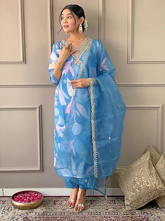 Be the first to review “Women’s Sky Organza with Cotton Lining Embroidered and Printed Straight Kurta with Rayon Pant and Organza Laced Dupatta Sets” Cancel reply